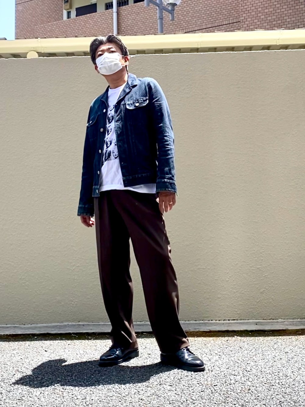 こんにちは😃♪ 今日はA.P.Cのデニムジャケットに ユニクロのスラックスで ネイビーブラウンの色合わせで リハビリに出かけます🌈 靴はドクターマーチンと どこかのコラボのものです。 暑いのですぐにTシャツで 過ごしましたけどね またよろしくお願いします🙇