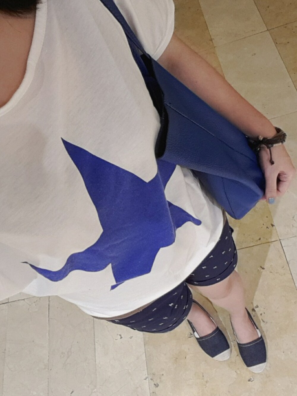 暑い今日😥、その海軍のスタイルは非常にクールに見えます 🚢 白色星T恤:街頭小攤 (Bangkok) 短褲: しまむら (JP) 鞋: Queen Shop (TW) 藍色羊皮包:皮件市集 ( FLORENCE ) 手上飾品:Chatuchak 假日市集 (Bangkok)
