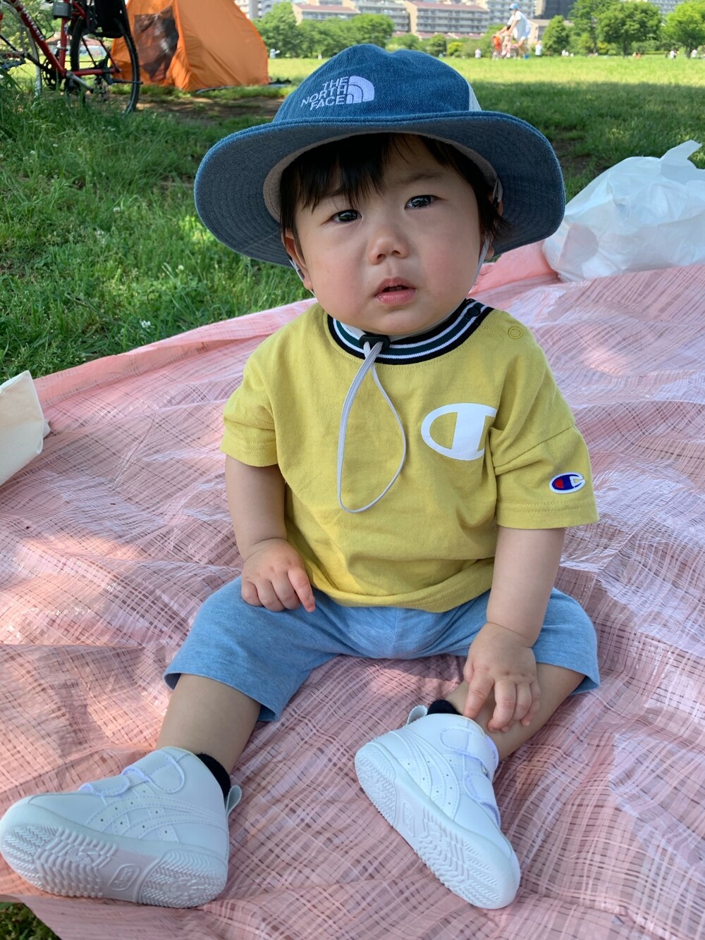 近所の公園へ。 靴イヤイヤで泣きべそ そんな顔も可愛くて思わずパシャリ チャンピオンのTシャツは マスタードの色と首元のデザインが お気に入り💗