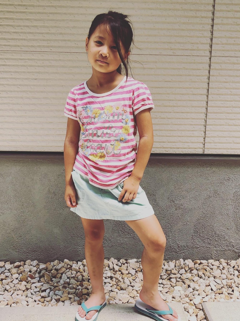 夏っぽいのにしよう!ということで決まったのがコチラ。100均のサンダルとエメラルドグリーンのスカートの色が合っております。 それっぽい表情をしております。
