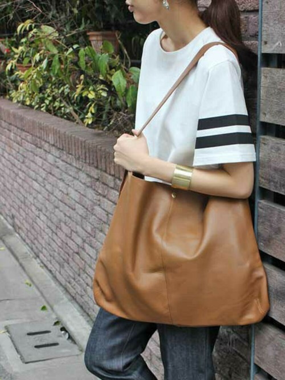 ちょっとカジュアルなスタイリングに。人気バッグをポイントに。