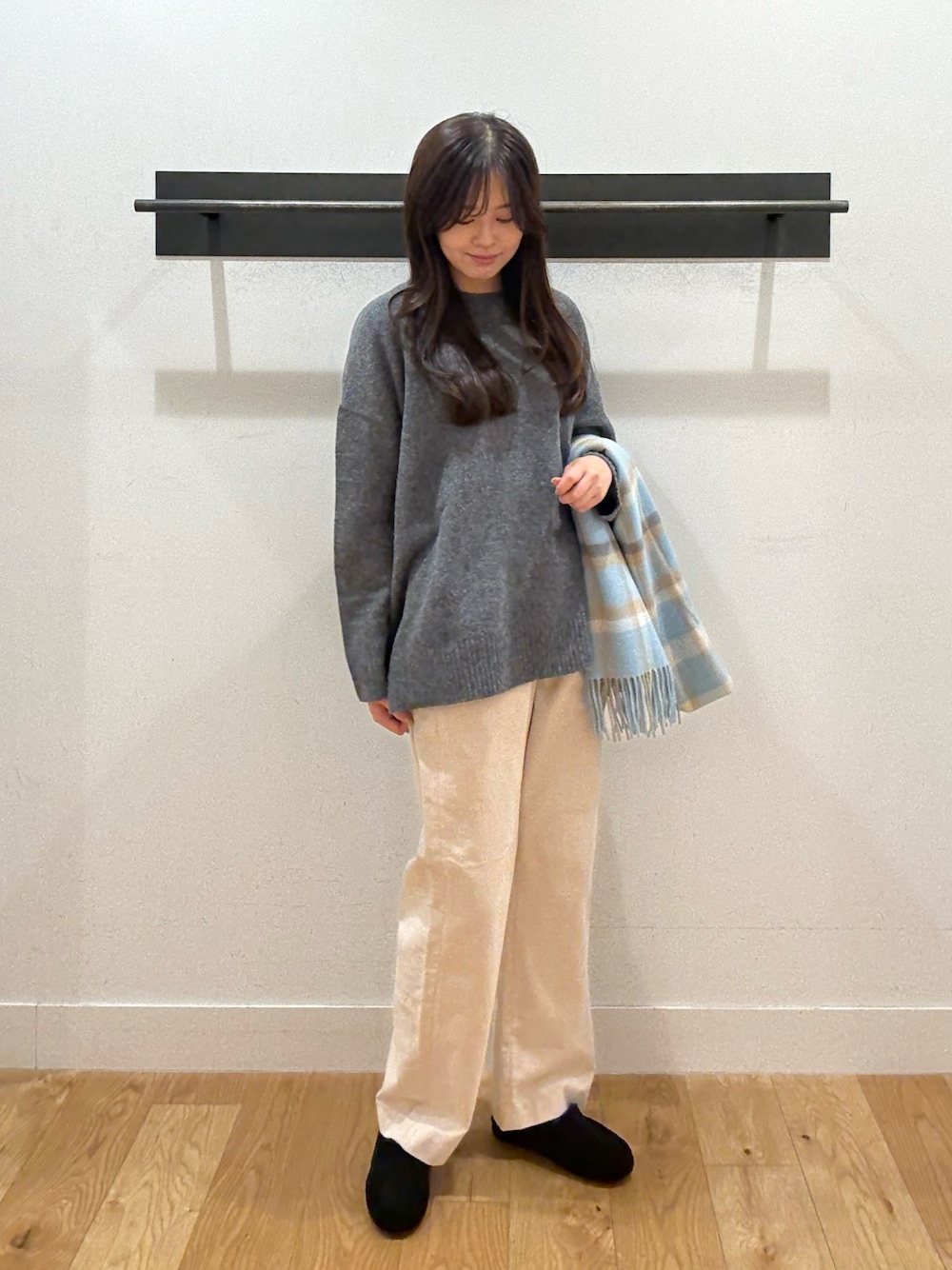 ふんわりとしたグレーのニットに、コーデュロイパンツを合わせたほっとするようなナチュラルスタイルです!😂☕️ やわらかな素材感と淡い色合わせで、シンプルながらもフェミニンな印象に。 チェック柄のストールが季節感とさりげない可愛さをプラスしてくれます🤍