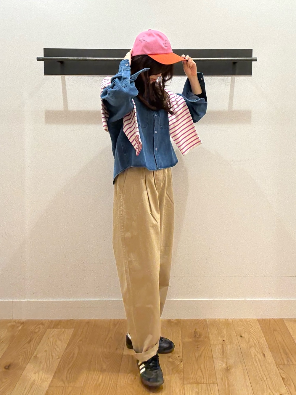 ピンクのキャップがコーデのポイントになり、春らしい印象に✨ いつものスタイルに少し遊びを取り入れたい日におすすめの、藤井大丸店 石田店長セレクトコーデです☺️