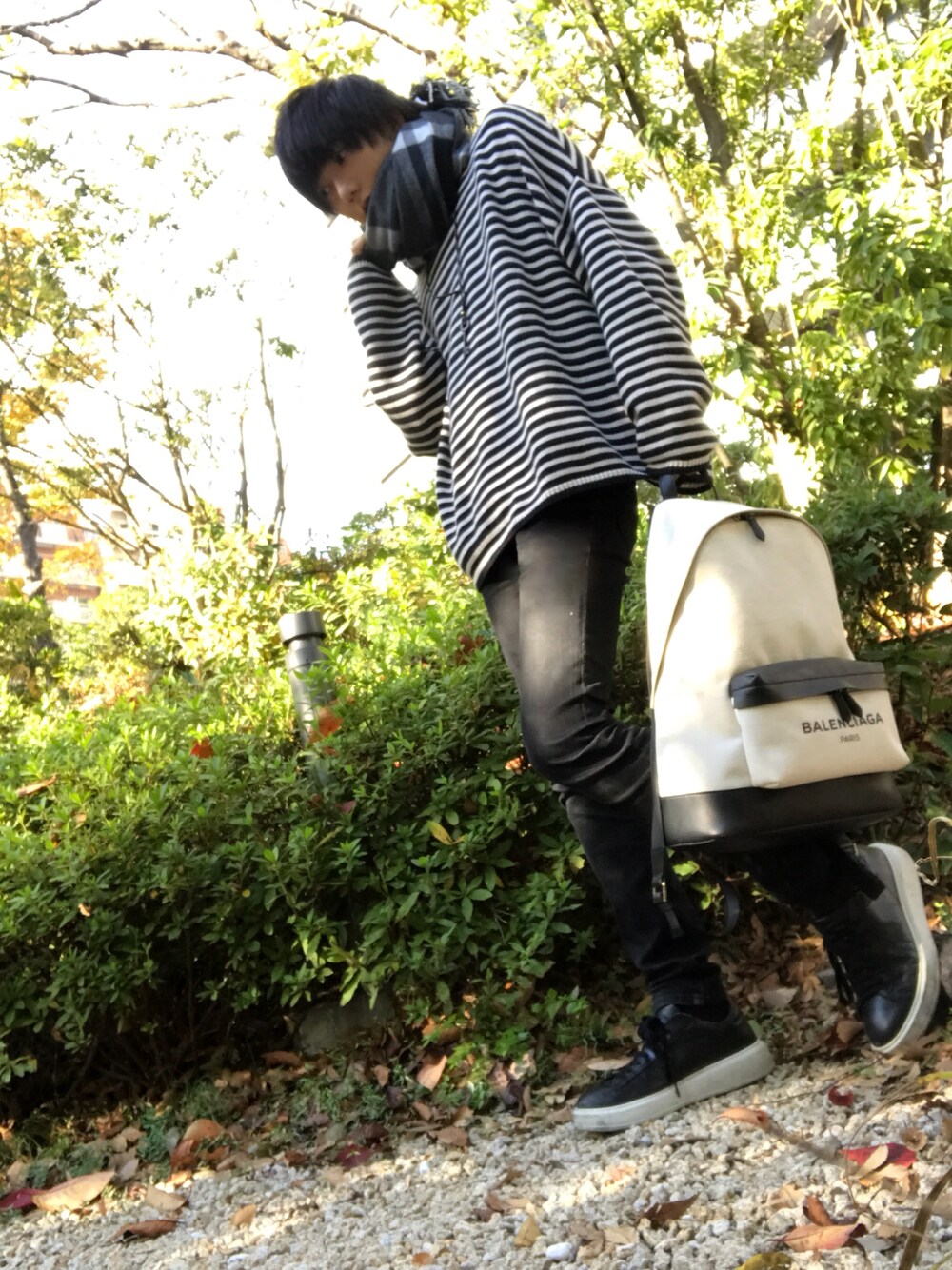 あったかい秋の服装 黒のリュックだと全体的に暗くなるので白の明るめのリュックで! ニットは幅広の袖でゆったり感がつよめでお気に入り インナーは黒のタンクトップでマフラーをとっても大丈夫 下は細く上はゆったりで小顔効果。