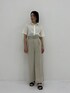 シンプルなワントーンコーディネート。シンプルだからこそ間違いないシルエットが安心感ぎあり、シルバーポイントがアクセサリー要素を取り入れた万能アイテムです。
