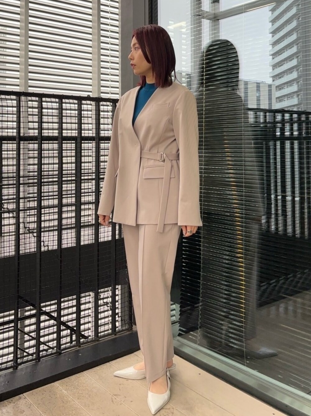 使いやすいセットアップが出ました!1つは持っておきたい綺麗めなセットアップは別々でも使いやすくシワにもなりにくいです。ジャケットのベルトは着け方次第で印象が変わります。フロントのボタンを開けて着てもシルエットが綺麗です◯