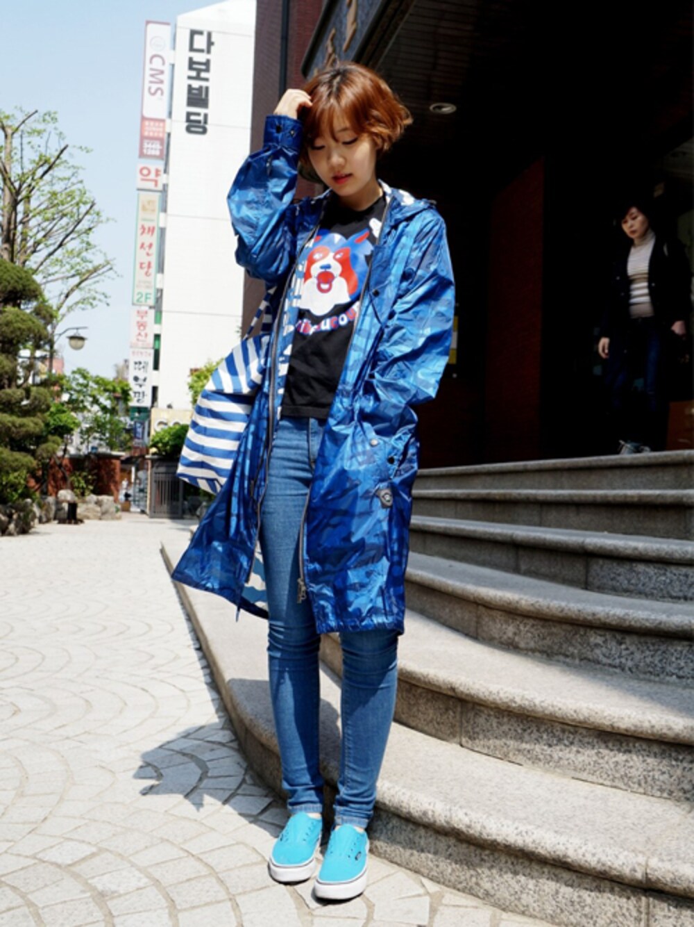 ブルー系のその他アウターを着用したレディースの春コーディネートの1枚目の写真