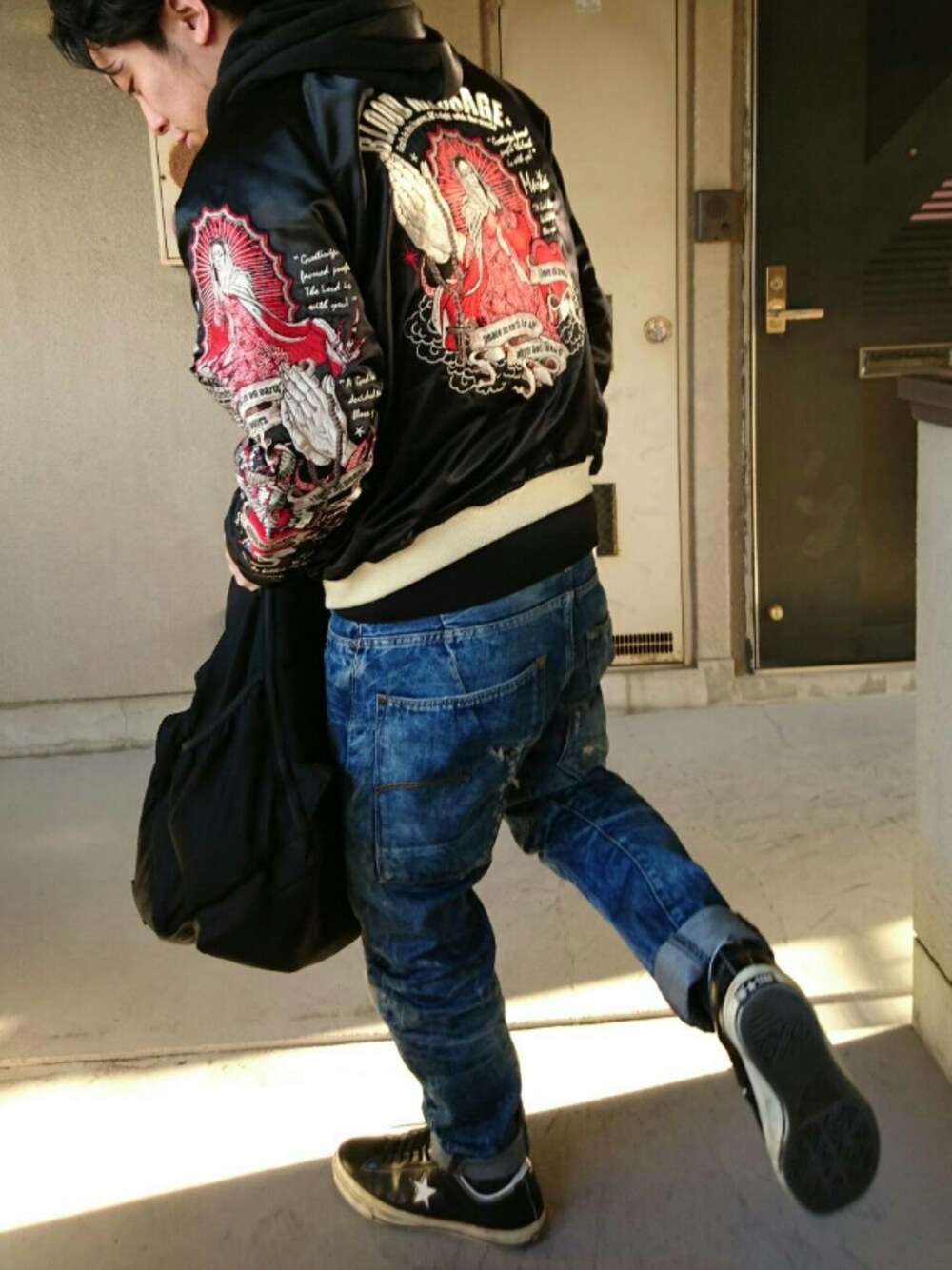 靴以外は全て古着です。 スカジャンは見たとき『すげーやつあるやん!全部刺繍やん!』 で一目惚れして購入。 ワンスターは某靴屋でソール色焼けにつき破格で購入。 ジーンズは決が破れたりしてるのを自分で夜中にコツコツ縫い合わせました☆ ロックんロールは縫い物する☆ 今日は夜通し仕事やからラーメン食べて出勤じゃい! では皆様またまた✌