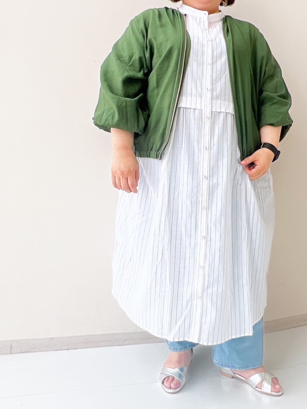 ⭐︎体型カバーコーデ⭐︎ ノーカラーJKで目線を上に! 首周りをスッキリさせると 小顔にみえるような(気がする♡) 衿ぐりのごちゃごちゃは暑いし 汗かきの対敵! だからノーカラーってありがたい♡ ウエスト切り替えがポイントのワンピース 薄手で軽い〜! 細いストライプのラインが 実は密かに縦長効果! ワンピ合わせのJKは 丈バランスが重くならないように ウエスト丈がいいかな 気になる下半身から目線をずらす 『トップス目立たせ作戦!!』 またズレ防止デニム愛用! すごくよく伸びるデニム〜 これは病みつきです! デニム合わせは股ずれ軽減にもなるし ポイントによく合わせます⭐︎