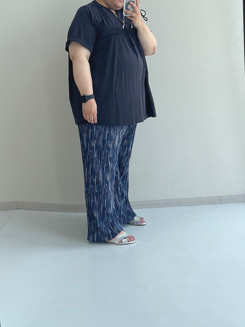 ⭐︎汗かきさんに嬉しいコーデ⭐︎ この時期の悩みと言ったらじんわり出てくる汗じみ(´;ω;`) 朗報! このトップス表に汗じみしにくい生地♡ それに程よい落ち感でからだにはり付かない! 後プリーツ初挑戦、背中のお肉たちがみえにくくなる?(気がする♡) マルチストライプのプリーツパンツ縦長効果アリ? なんといっても軽いー!! 履いてないみたい(笑) 足元はお気に入りのシルバーサンダルが活躍! 全体に暗いカラーになりがちだけど 柄や靴などにポイントカラーを持ってくると目線のカモフラージュになって良し( •̀ω•́ )و✧