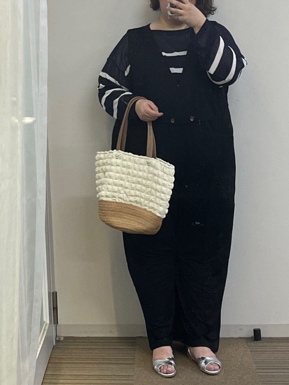 ♡初コーデにチャレンジ♡ シアーニットandサロペット! サロペットってこんなラクなの??ってびっくり! よく伸びるしライン出にくいし何より軽いー!! 一瞬お出かけ着みたいな印象だけど実は 楽ちんウエア♡ 脱ぎ着もしやすいから安心! シアーボーダーは程よい透け感! 着回しが色々できそうな予感! ボーダーでも子供っぽく感じないのが嬉しいなー。 お気に入りのシルバーサンダルも合わせてみました^_^ 意外と縦長にみえる(気がする♡)コーデできた!