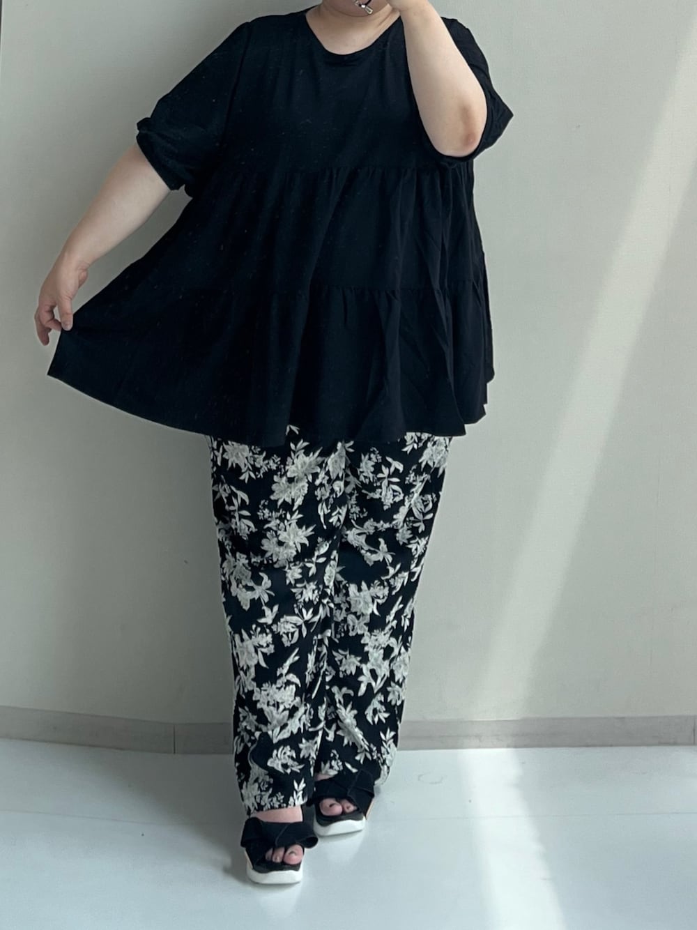 ★可愛くなりすぎないティアード★ 甘々コーデはどうも苦手で ティアードには手が伸びなかったけど このティアードはいける!! サラサラでストンッと落ちる生地だから ふんわり丸く膨らまない! なんなら生地が余ってみえる? (気がする♡) 袖も肘上まであるし袖口もキツくない! うまい具合に見せたくないところが隠れて (๑˃̵ᴗ˂̵)و ヨシ! 衿ぐりの後ろ、リボンに結んだら可愛い! (ん?甘々いけるか?笑) これ着た時ひんやりする(☆∀☆)キラーン! お尻が全部隠れないトップスには ゆるワイドストレートのパンツがバッチリ! ブラックベースの花柄が 甘くなるところを抑えてくれますꕤ︎︎·͜· ︎︎ 肌にくっつきにくいから夏にいいなあー! 初のチャレンジのリボンデザインサンダルはベルトが調整できて めちゃラク〜! 甘々コーデ苦手とか言いながら 足元は可愛くてもいいのだ。 ✿゚❀.(*´▽`*)❀.゚✿