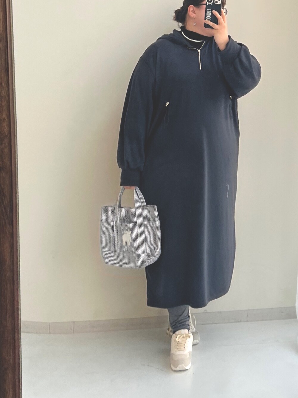 nunu*(nissen本店)のワンピース「<大きいサイズ> ウエストドロストハーフジップパーカーワンピース」を使ったコーディネート