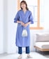 【トップス】 ・パッと目を引くブルーのストライプは、縦のラインを強調してくれるので全体がスッキリ見えます。 ・首元のキーネックデザインがデコルテに抜け感を作り、お顔周りをシャープな印象にしてくれました。 ・ふんわりとしたボリューム袖ですが、手首のゴムで好みの位置にブラウジングできるのが嬉しいポイントです。 【ボトムス】 ・裾から白のレギンスを覗かせて、重たくなりがちなロング丈に軽やかさをプラスしました。 ・ワンピースの裾に前後差があるデザインなので、レギンスを重ねても足元がもたつかず綺麗に決まります。 ・レギンス一本挟むことで、アクティブに動きたい日も安心感のある着心地でした。 【シューズ・バッグ・小物】 ・足元は黒のスニーカーを合わせて、爽やかな配色をグッと引き締めて大人っぽく。 ・お団子ヘアにまとめることで、ボリュームのあるワンピースとのバランスを取り、重心を上げました。 ・眼鏡などの小物使いで、カジュアルな中にも知的なエッセンスを添えています。 【スタッフのつぶやき】 ・体のラインを全く拾わないのに、ストライプのおかげで着膨れして見えないのがこのワンピのすごい所です!