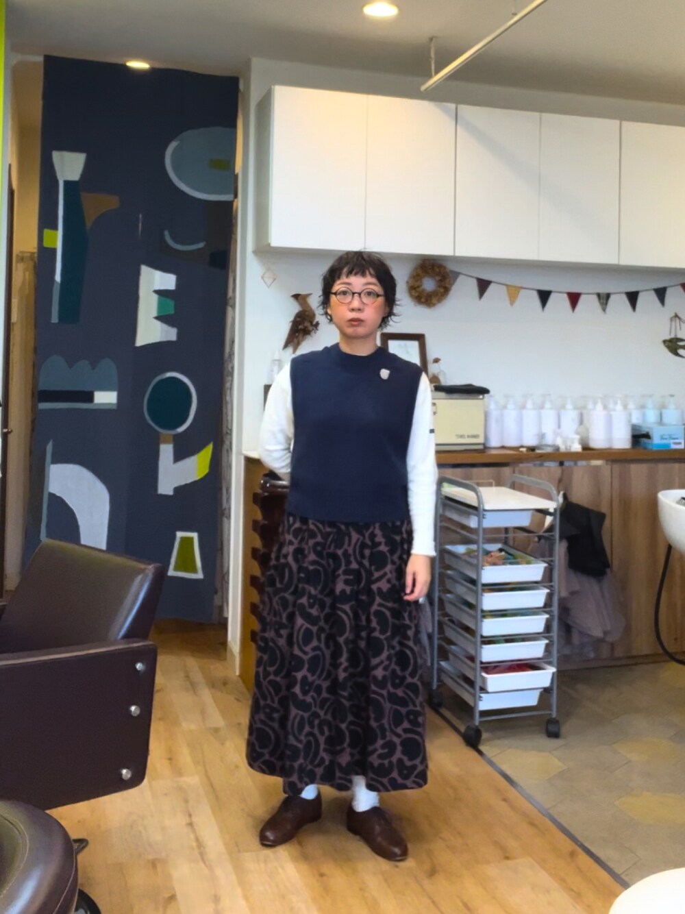 紺色ベストバージョン。 この秋色スカートは綿なので、今から着用できて、暑すぎないし、温かく履けたりもできそうなので、いいです。