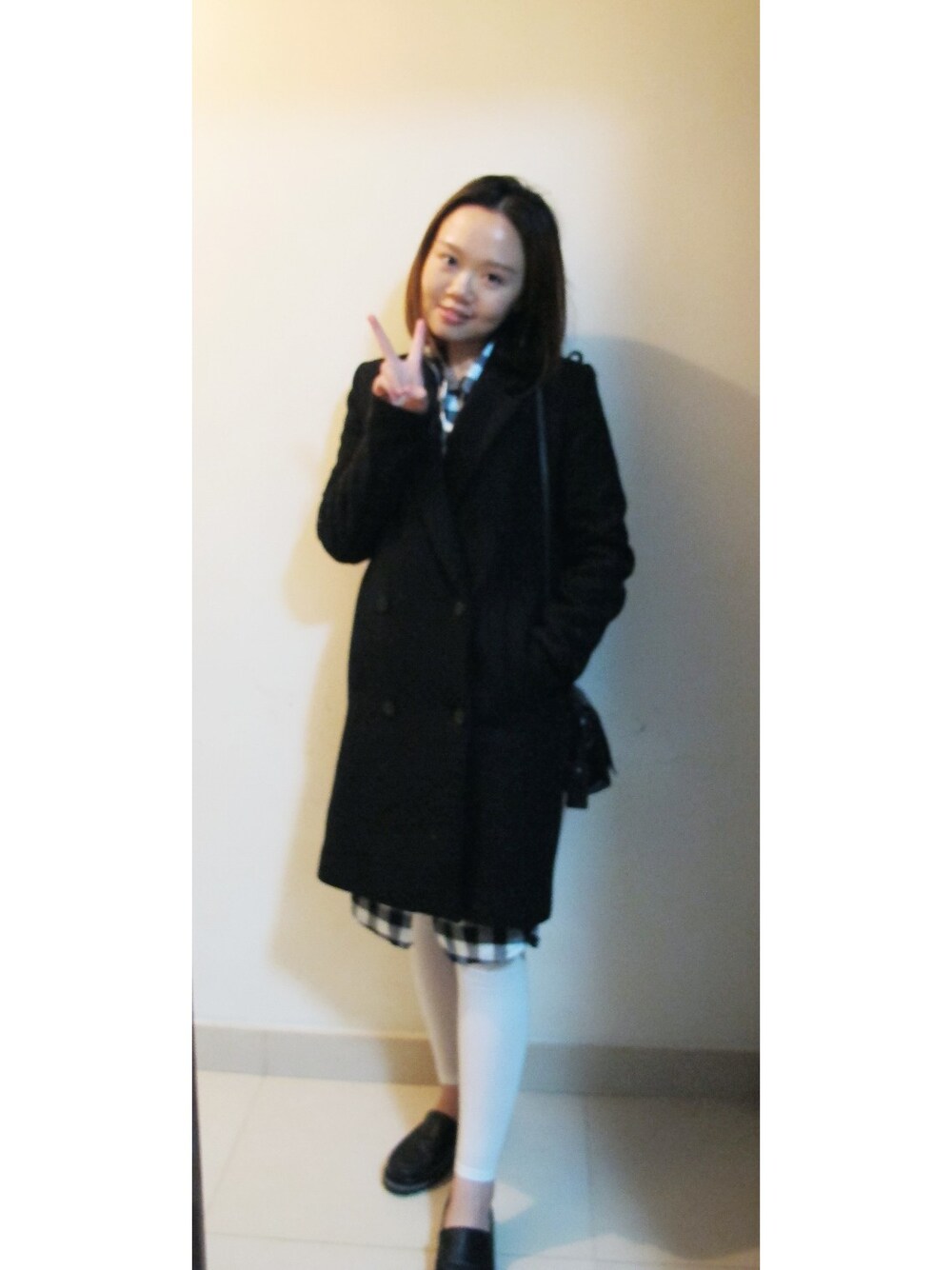 the theory of winter dressing: black!!!!!!! black coat long checked one piece white leggings black mini square bag black loafer