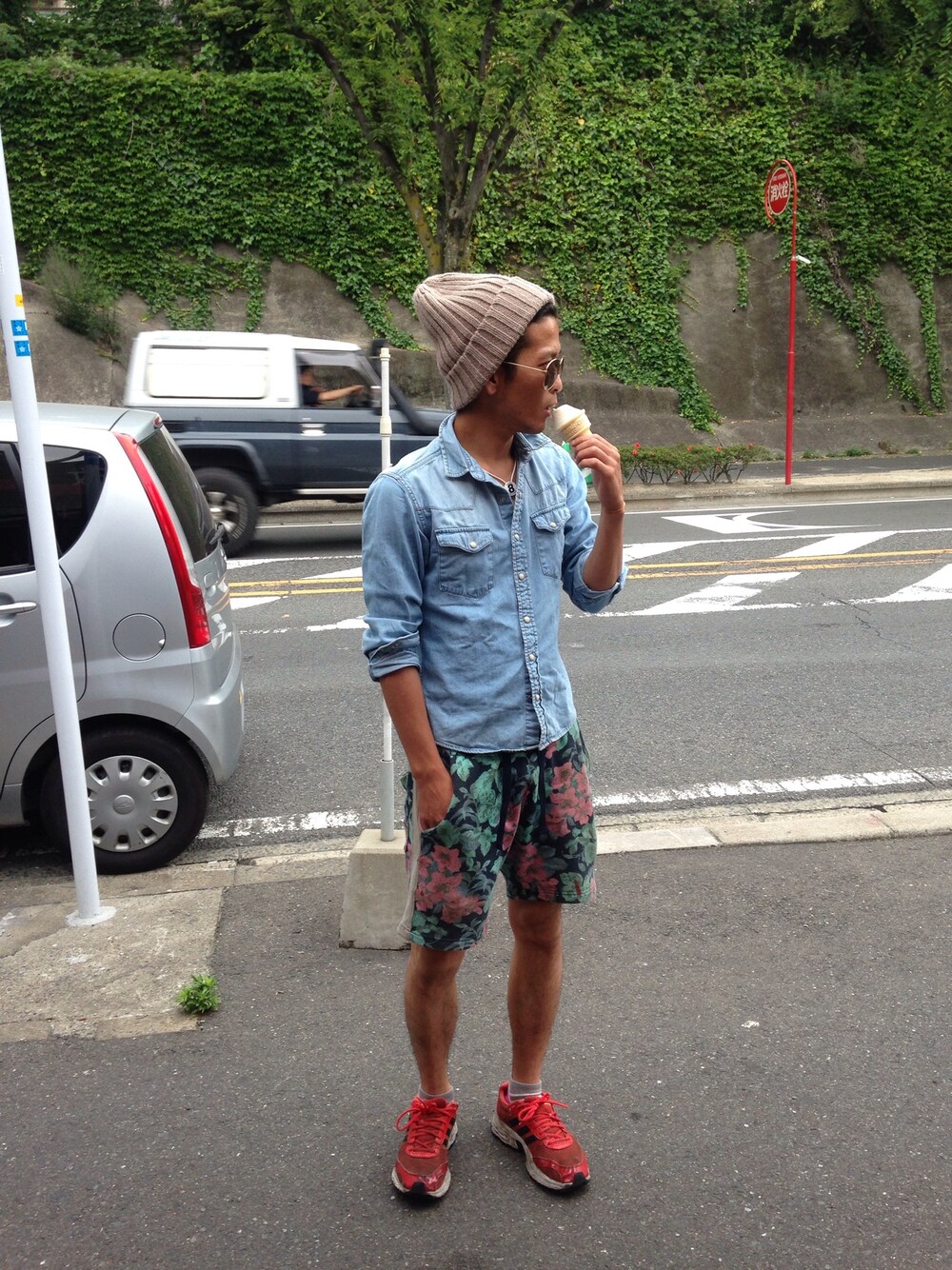 レッド系のスニーカーを着用したメンズの夏コーディネートの1枚目の写真
