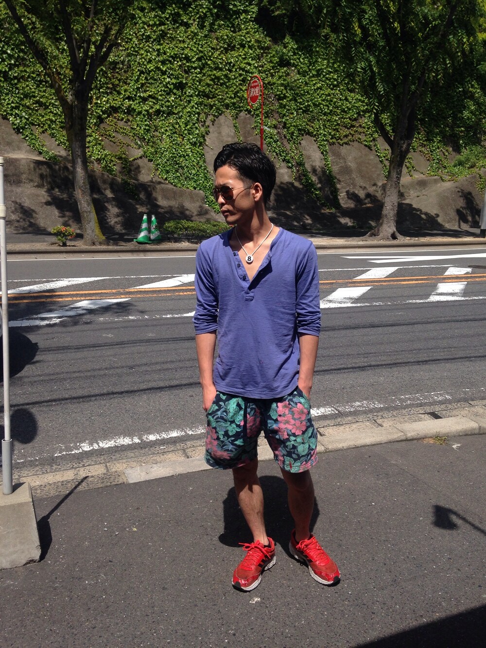 レッド系のスニーカーを着用したメンズの春コーディネートの1枚目の写真