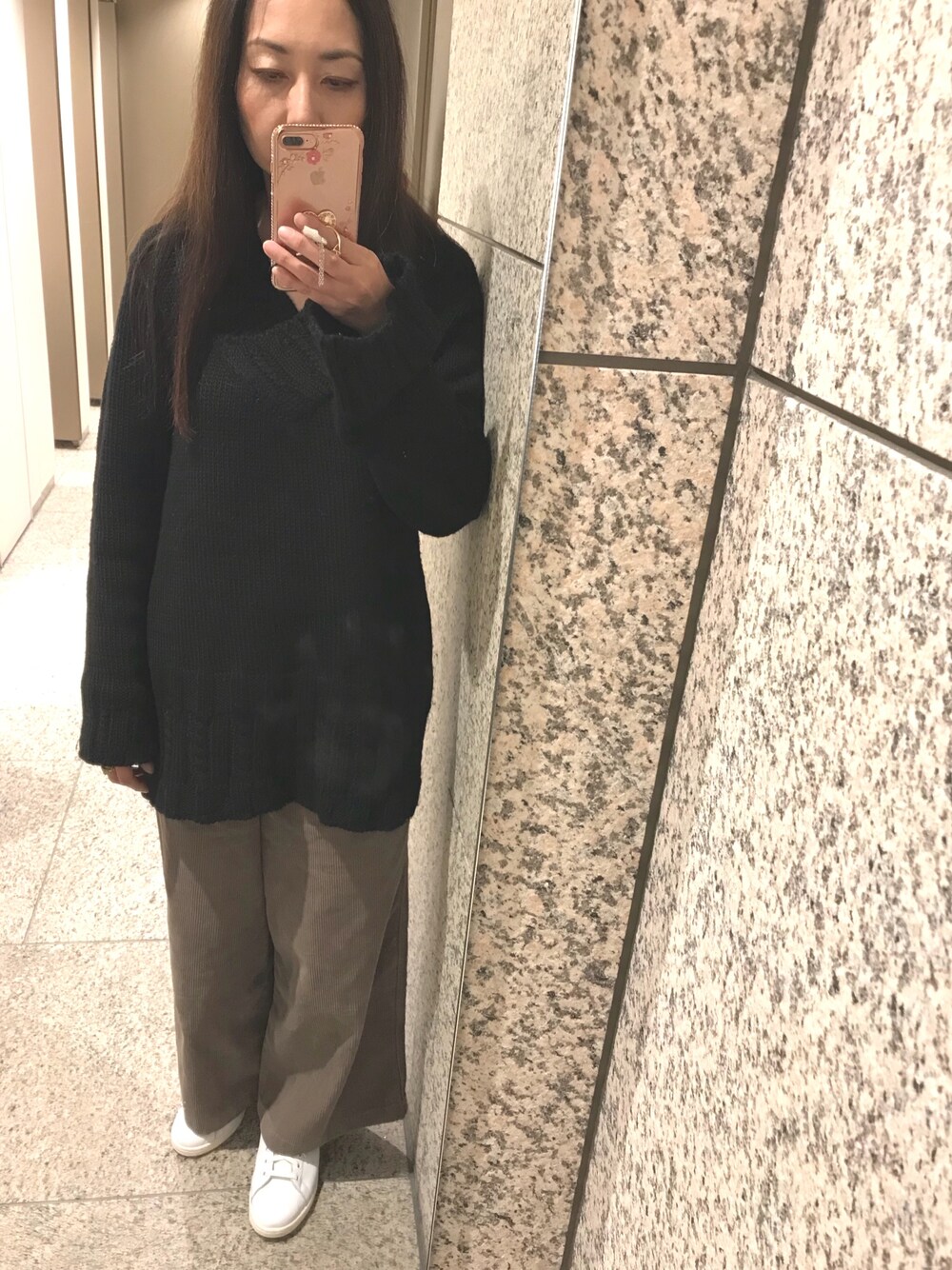 大きめニットにコーデュロイのワイドパンツを合わせてみました。足元はスニーカーではずしコーデ。