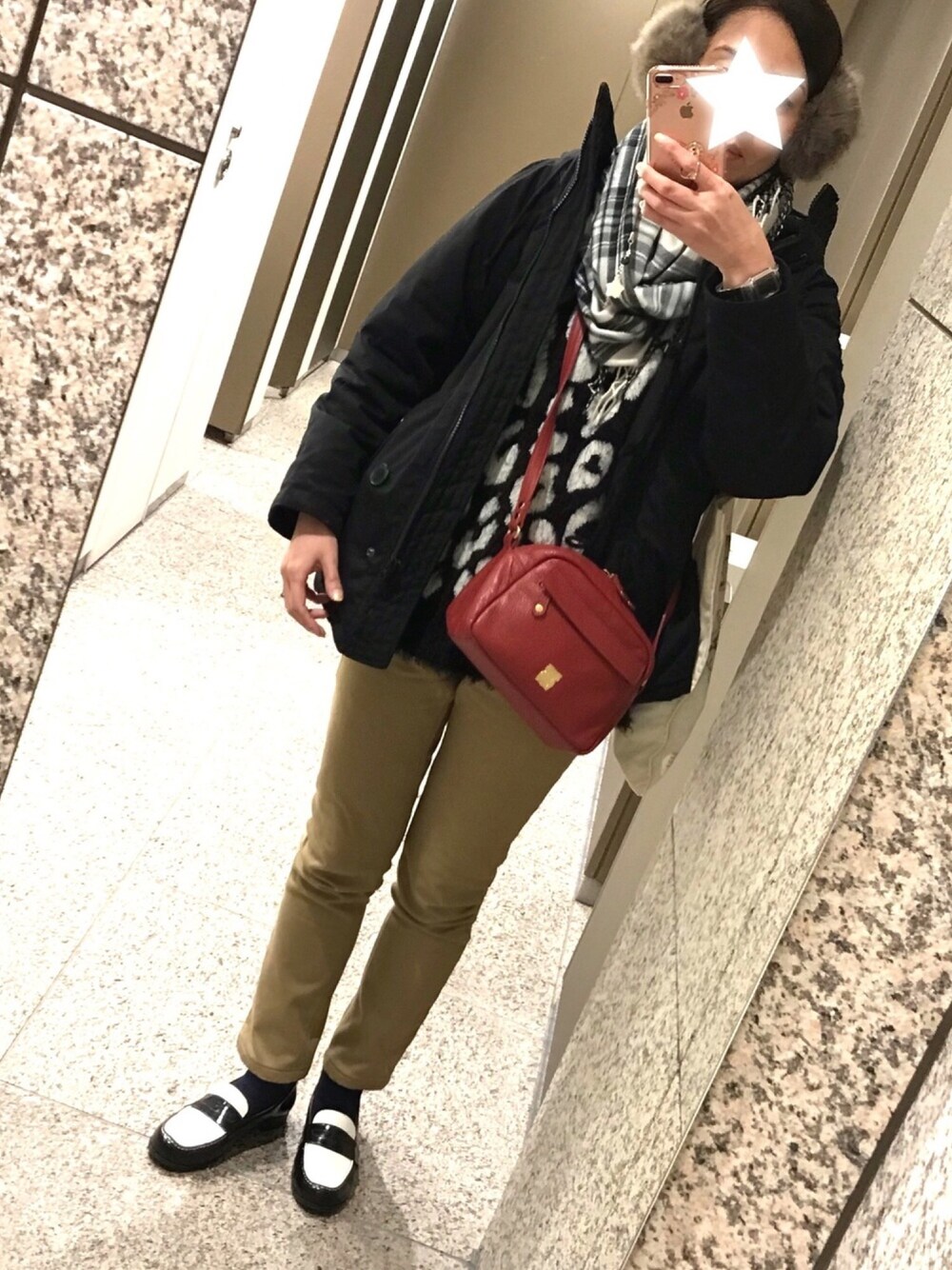 いつもはアウターを脱いで写真を撮っていますが、リアルではこんな感じです😋 イヤーマフ、一度着けるとあったかくてやめられません。 パンツも裏起毛になっているので、けっこうぬくぬくしてます😄 ただ、やっぱり丈が短い…💦 ローファーはけっこう探して買いました。 イメージぴったりサイズもぴったりでハッピーになりましたー💕