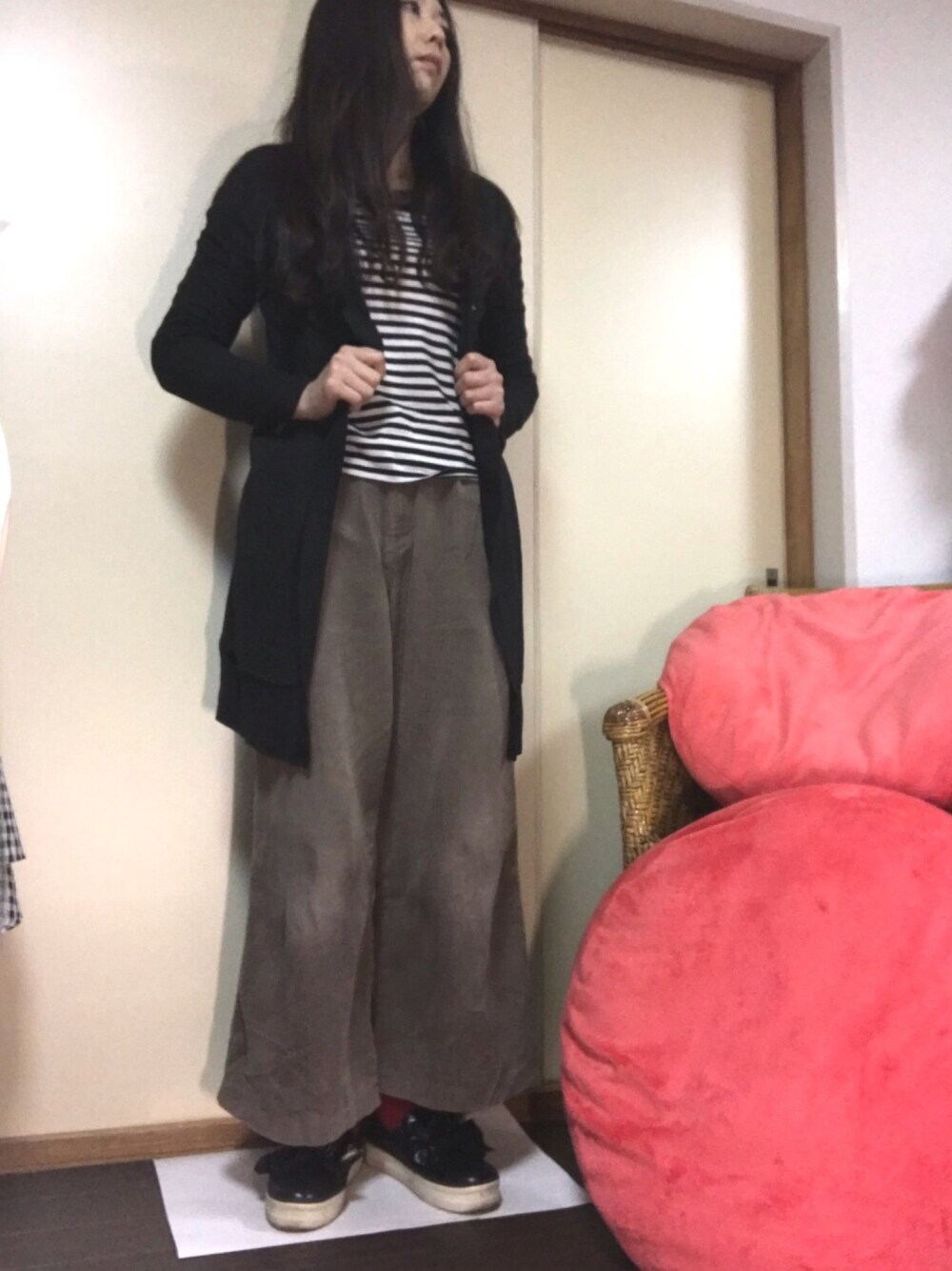 おはようございます☀ ご覧いただきありがとうございます😊 楽チンコーデです。 コーデュロイのパンツは絶妙な色味でホコリが目立ちにくくて助かります。 ロングカーディガンはメンズのものです。カットソー素材だけど結構暖かいです。 先日、高いヒールの靴で買い物に行って、膝痛めたので、当分ペタンコ靴しか履けないです… 靴も整理したいんですが、足が大きいので譲り先が見つからず…どなたか足のサイズ25センチの方、いらしたら連絡ください!