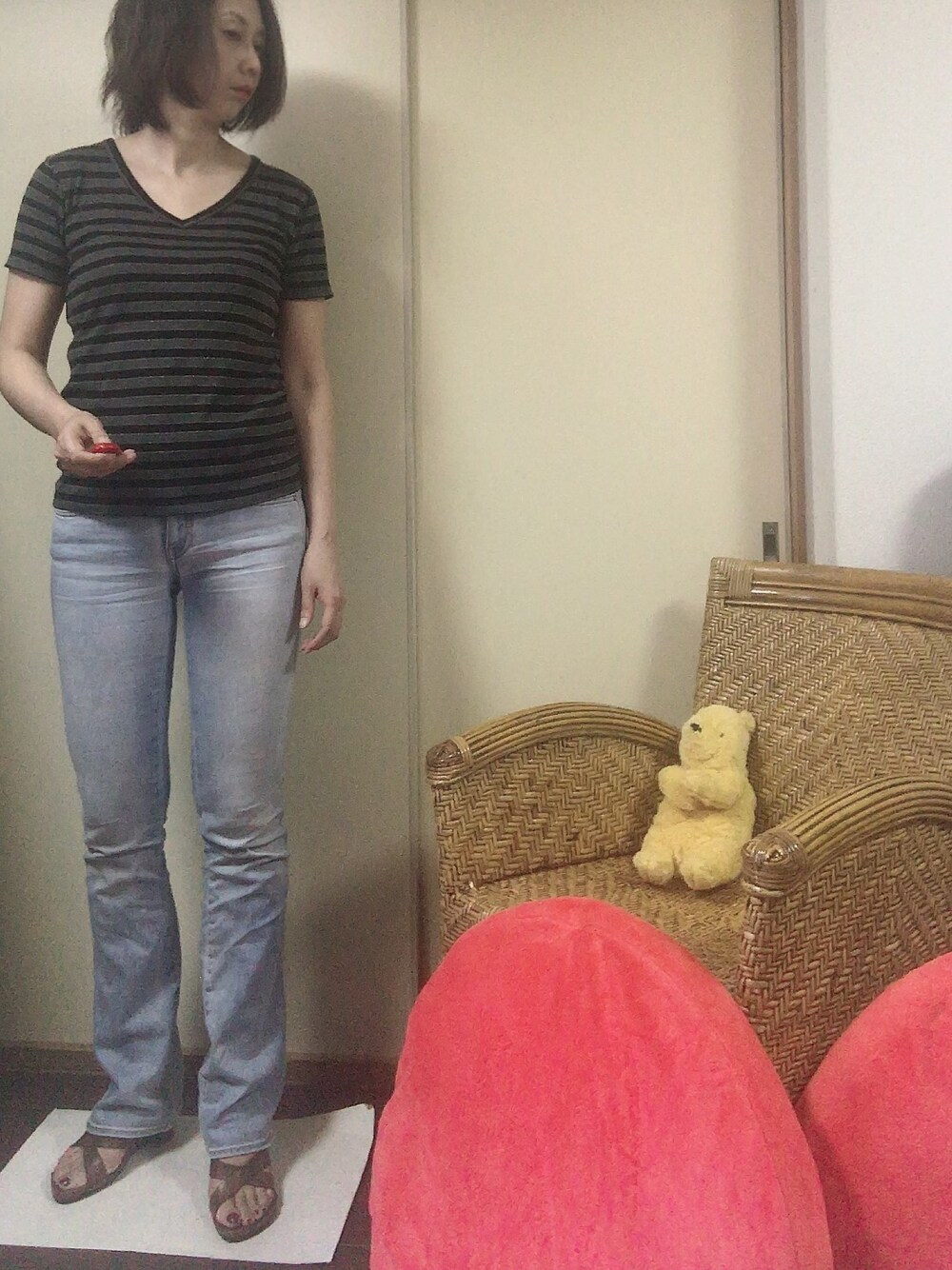 ご覧いただきありがとうございます😊 VネックのTシャツとデニムのコーディネートです。 Tシャツはメンズのもの。少し薄手だけどしっかりした生地。結構着てるけど形崩れしません。 デニムは結構着てます。特に会社に行かない日にはヘビロテです。 サンダルは足裏にフィットしてるので楽かと思いきや、ヒールが結構あるので、たくさん歩く日にはキツイかなあ。 今年はサンダルは買いません❣️(ただしセール次第では…)