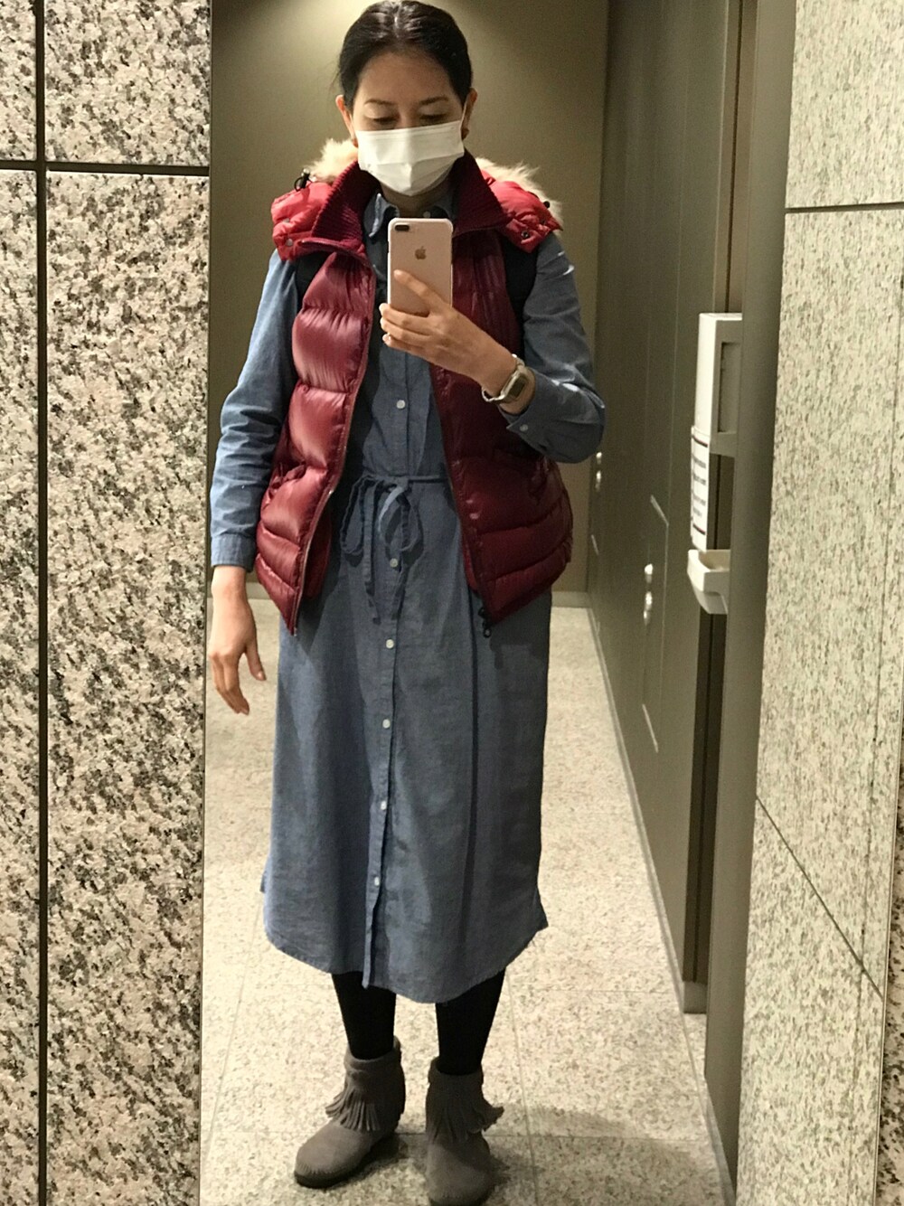 ご覧いただきありがとうございます😊 シャツワンピとダウンベストのコーディネートです。 今しかできない感じ。 ていうか今年、暑いですよね。 昔の9月って今みたいな気候だった気がします。