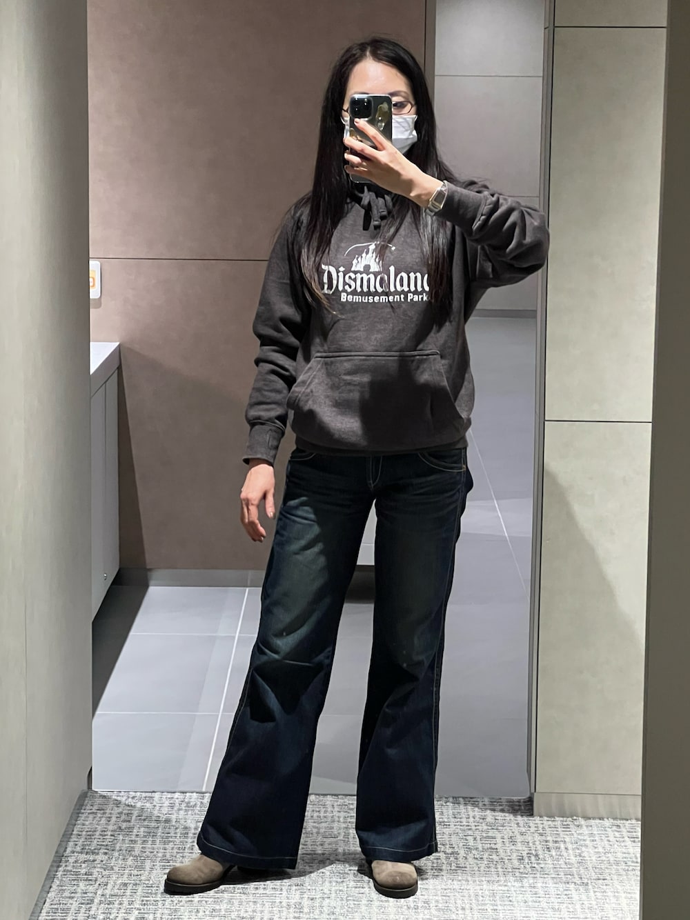ブルー系のデニムパンツ、グレー系のパーカーを着用したレディースの春コーディネートの1枚目の写真