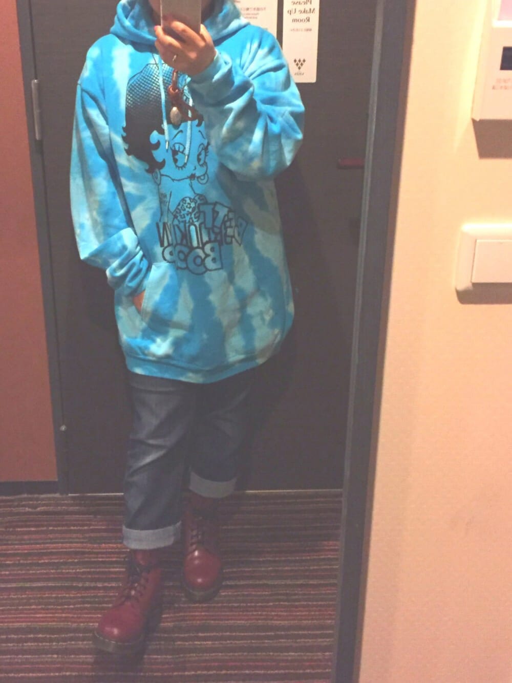 ベティちゃんのパーカーは、 大阪アメ村 "☺︎Mr.39" にて購入♡ ロケットチョーカーは、 金具要らずの革紐を結んだだけの簡単手作り。 紐の長さ調整もちゃんとできるので、 なかなか重宝しています♡