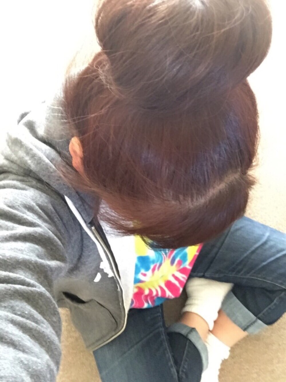 ひさびさ お団子スタイルー。 ちょっとでも 若く見られたいっつーんで、 いつもより高い位置に ひっつめひっつめ がんばってみましたよ っと。