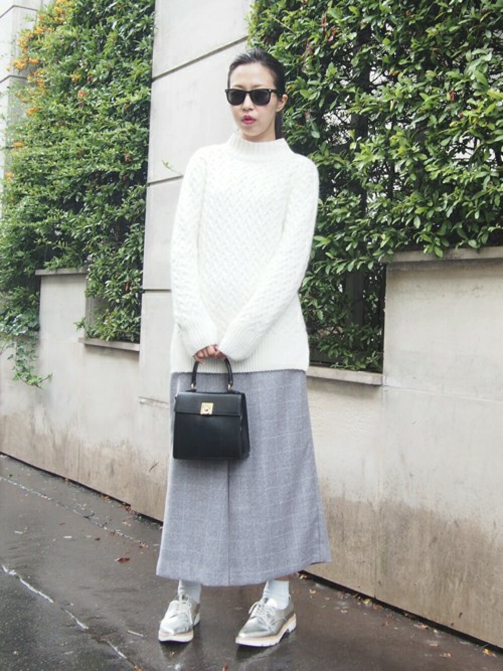 ハイネックのデザイン編みニットTOPSは 一気におしゃれ度がUPするスカート見えするパンツで今年風に。 リラックスした快適なパンツスタイリングで大人のエフォートレスSTYLEの完成です。