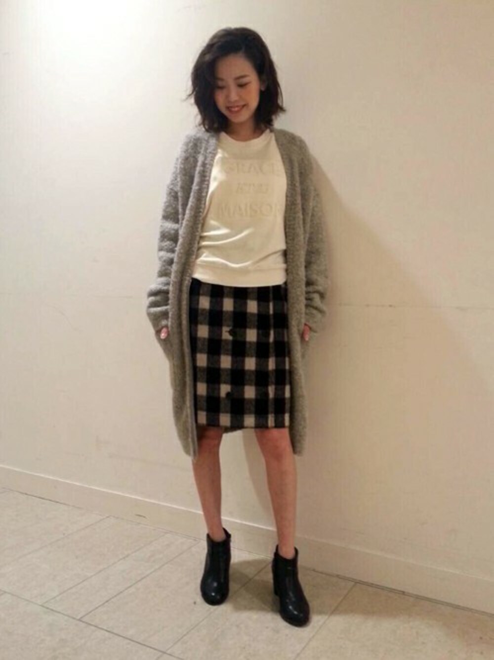 今の時期にぴったりなニットコートに AGNOSTで人気の高いエンボスのロゴTOPS、 ラップスカートを合わせて上品なフェミニンカジュアルスタイリングに。