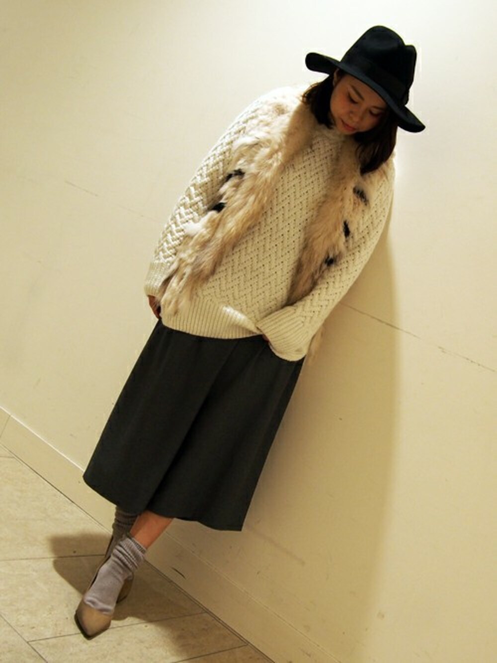 ニットチュニックにフレアパンツを合わせた エフォートレススタイリング。 フリンジのファージレをコーディネートのポイントに。