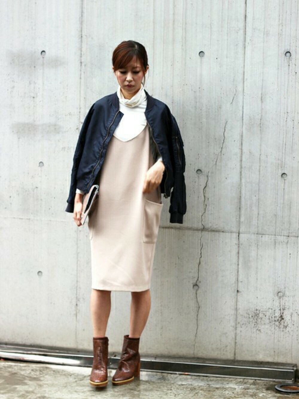 女性らしい優しいカラーのエプロンワンピースにあえてメンズライクなMA-1ブルゾンを組み合わせることによって、フェミニンさを持ちながらもモードで大人っぽく着こなせます☆