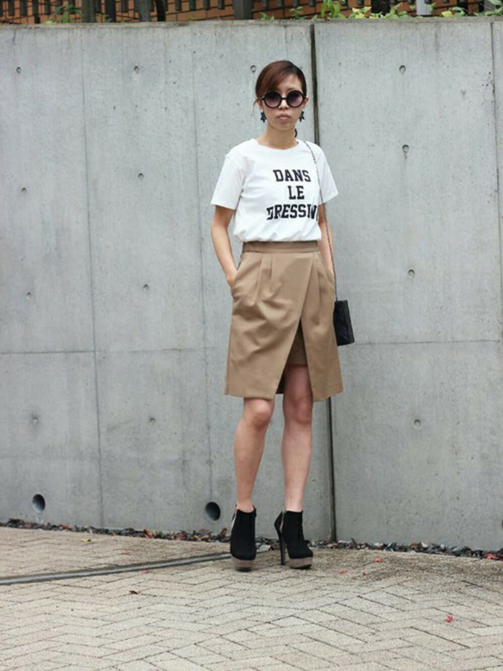 今年の春夏大注目のスカート見えするパンツ "スカンツ" ボトムに変化があるので、あえてトップスはスッキリしたロゴTを合わせて、大人シンプルコーデ☆