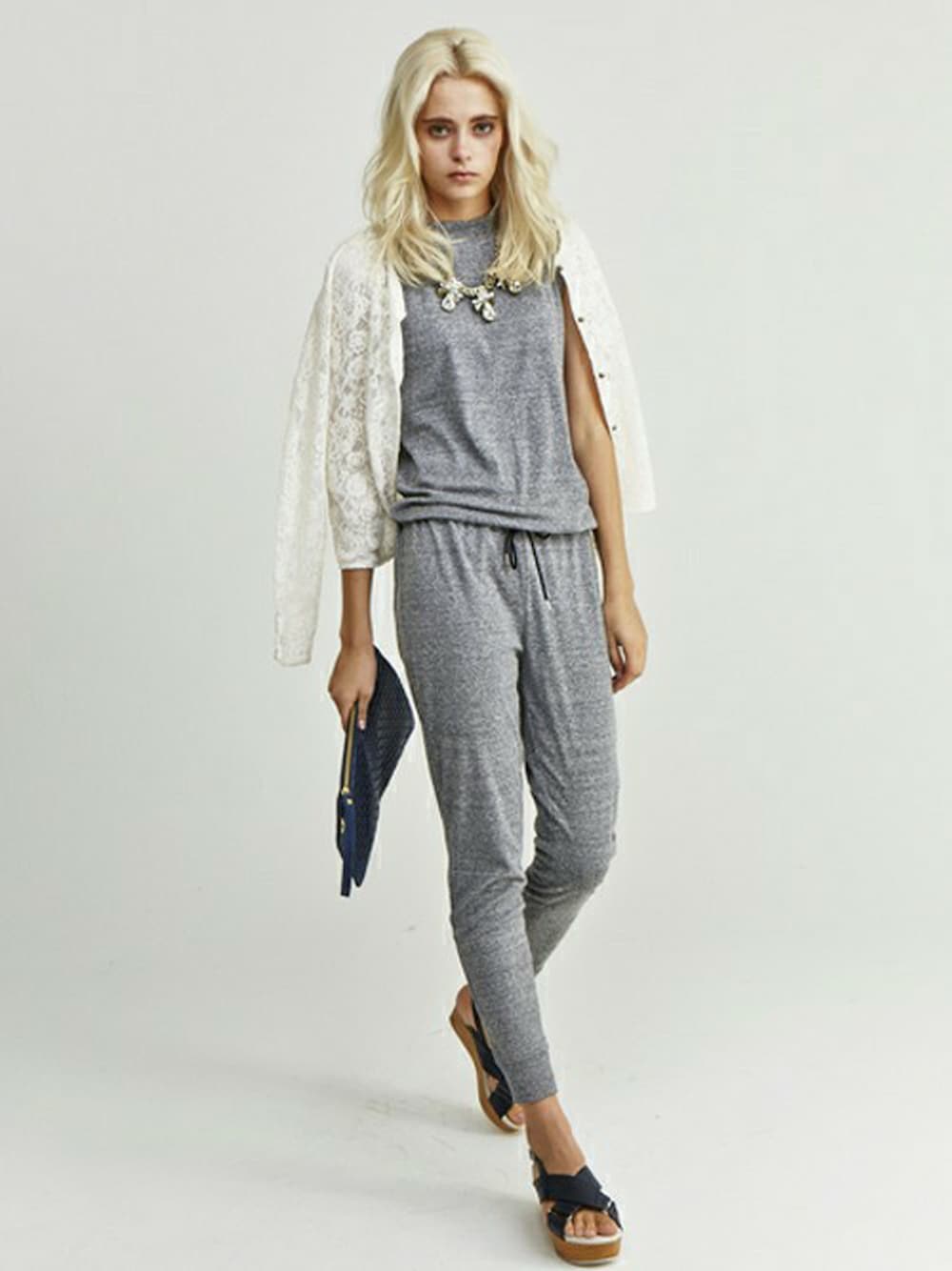 カジュアル素材のメンズライクなオールインワンに、レースのカーディガンを肩かけでコーデすることによって、フェミニン要素をプラスし、大人リラックススタイルの完成☆