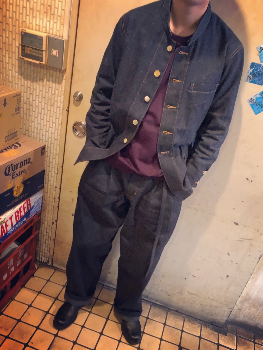 デニムのセットアップです。 ジャケットは学ランをパンツはボンタンを基にしています。