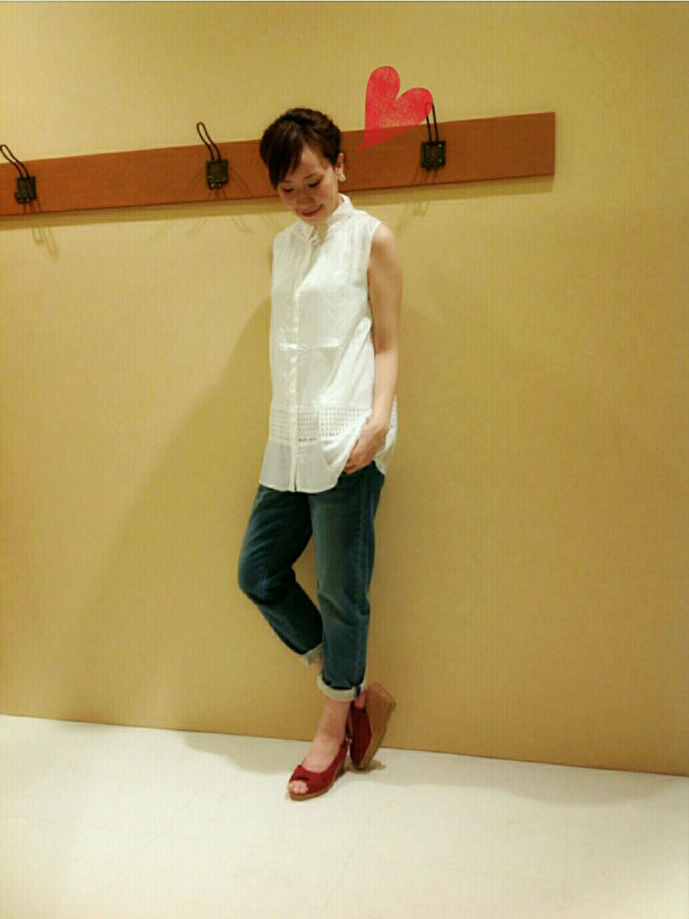 ノースリーブのチュニックに、デニムを合わせて、足元は赤のサンダルで差し色を。 ロールアップしたボーイフレンドデニムにヒールの合わせは好きなコーデ❤ ノースリーブ着たの1年ぶりだ。