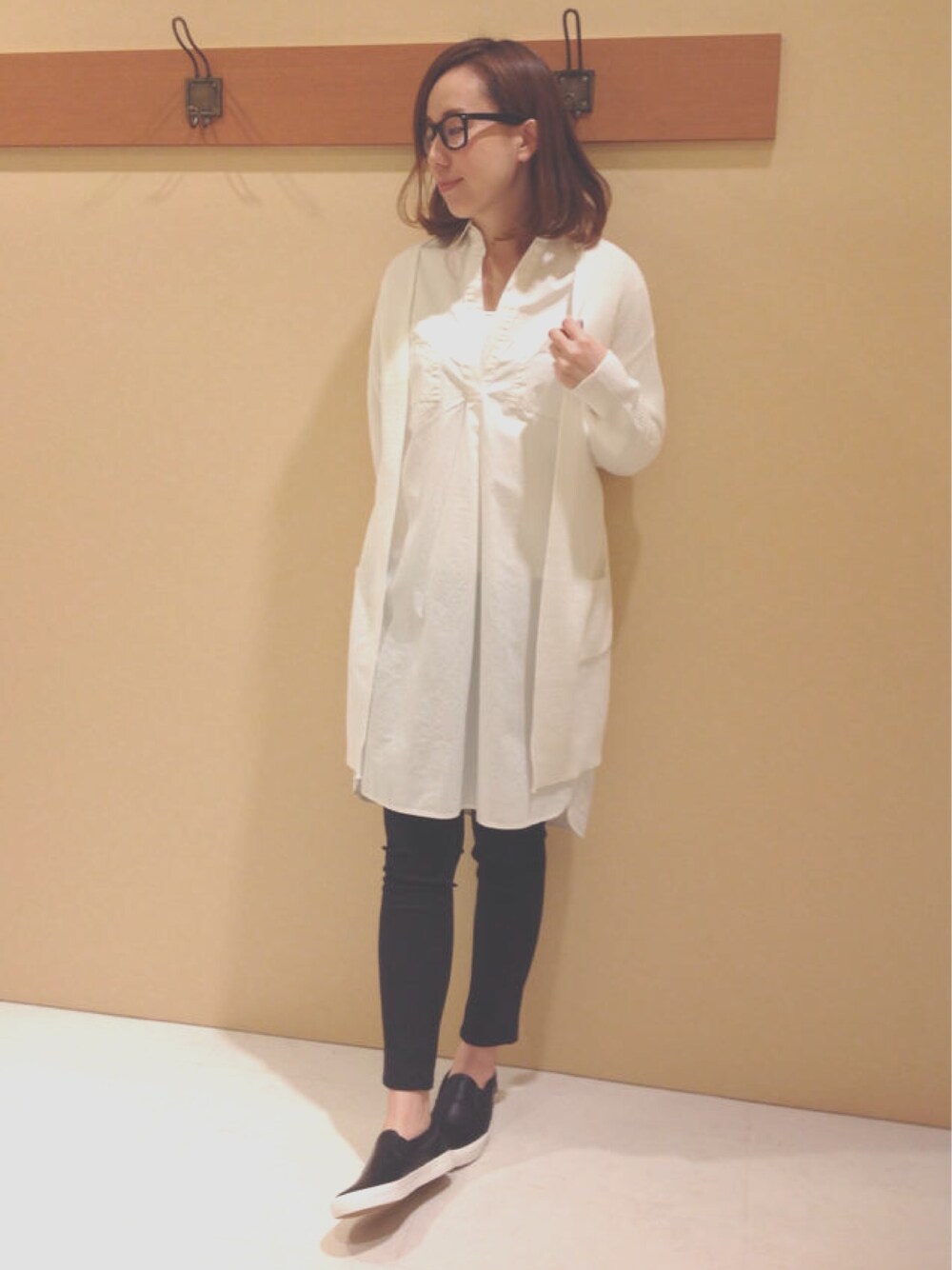 珍しくモノトーンコーデ このシャツワンピかっこいいのでお気に入りです(・ω・) パンツとスニーカーを黒にしたので、黒ぶちメガネでバランスを。