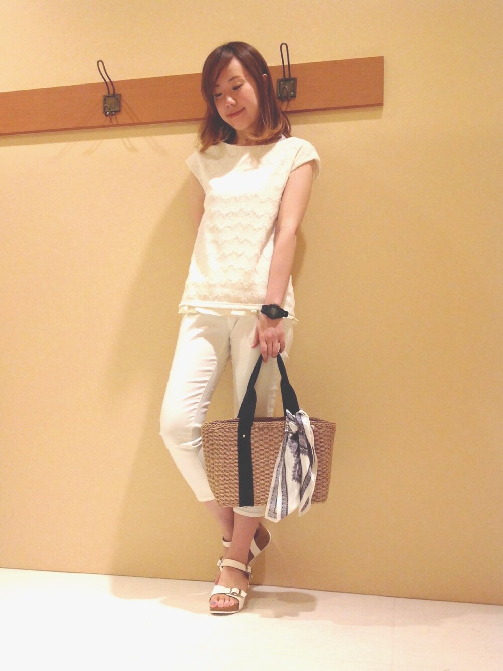 真っ白コーデで夏感満載にっ! トップスのさり気ないフリンジ使いがかわいい1枚です♪ 今年はバンダナを、どこかにプラスすると今年っぽく仕上がりこなれ感もでますよん(*^^*)