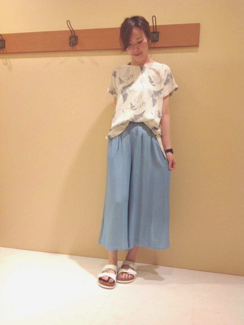 ボタニカルプリントのブラウスで夏感あっぷ(*^^*) パンツの素材がテロっとしていて肌触りが良いのでお気に入りです♡ 実はこれセットアップでトップスもあるので、その内のせます♪