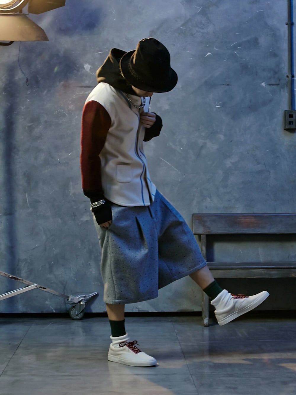 (A)crypsis ⽑毛料棒球式襯衫,主題概念為『000』,是⼀一種回到原點、⼀一切從零開始的概念。設計上延續『將不合理合理化』的巧思,把原 本使⽤用棉質料的傳統式棒球衫改良,選⽤用了⽑毛料製作,變成⼀一件外穿式的⽑毛料外套,可內搭在⼀一般正式的⼤大⾐衣內,或者單獨外穿,視覺上 強烈並兼具保暖功能,是⼀一款時裝融合街頭感的設計,並在背後使⽤用同⾊色調主題『000』的拼布設計,有層次的細節提升服裝整體質感。