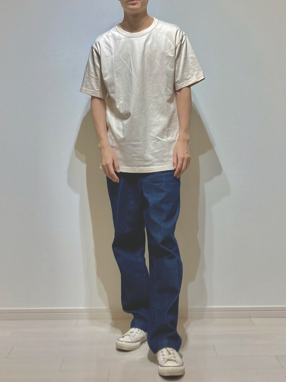 シャツ×デニム×スニーカー これだけで決まりますね! ユニクロのTシャツはカラーバリエーションがありますし、生地も丈夫で好みです。