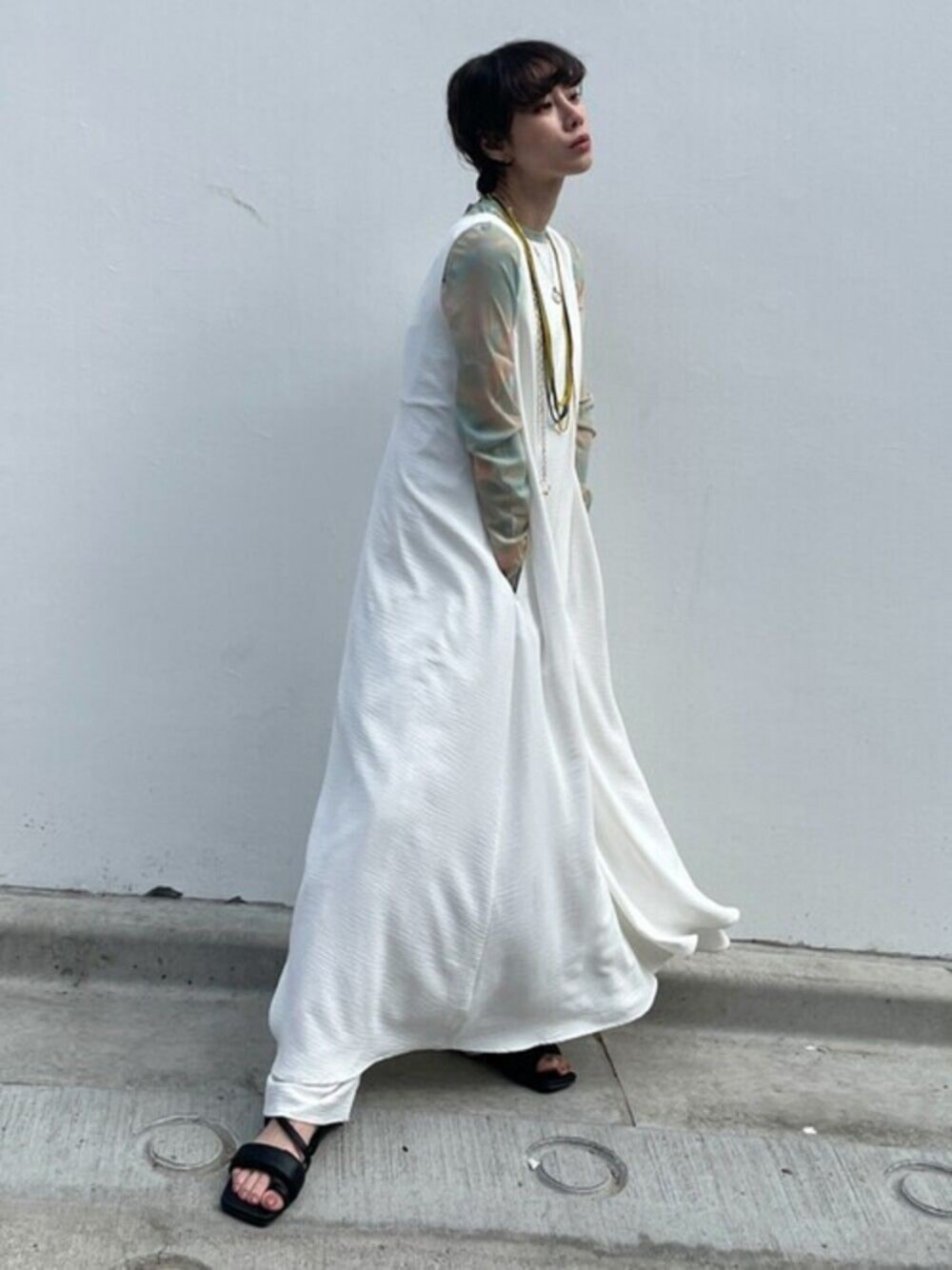 白のワンピースを主役に、清涼感あるスタイリング。 パンツは同素材の組み合わせで、これからの季節長く着られる。 SNAP_LISA[157] insta_@lisa__suu