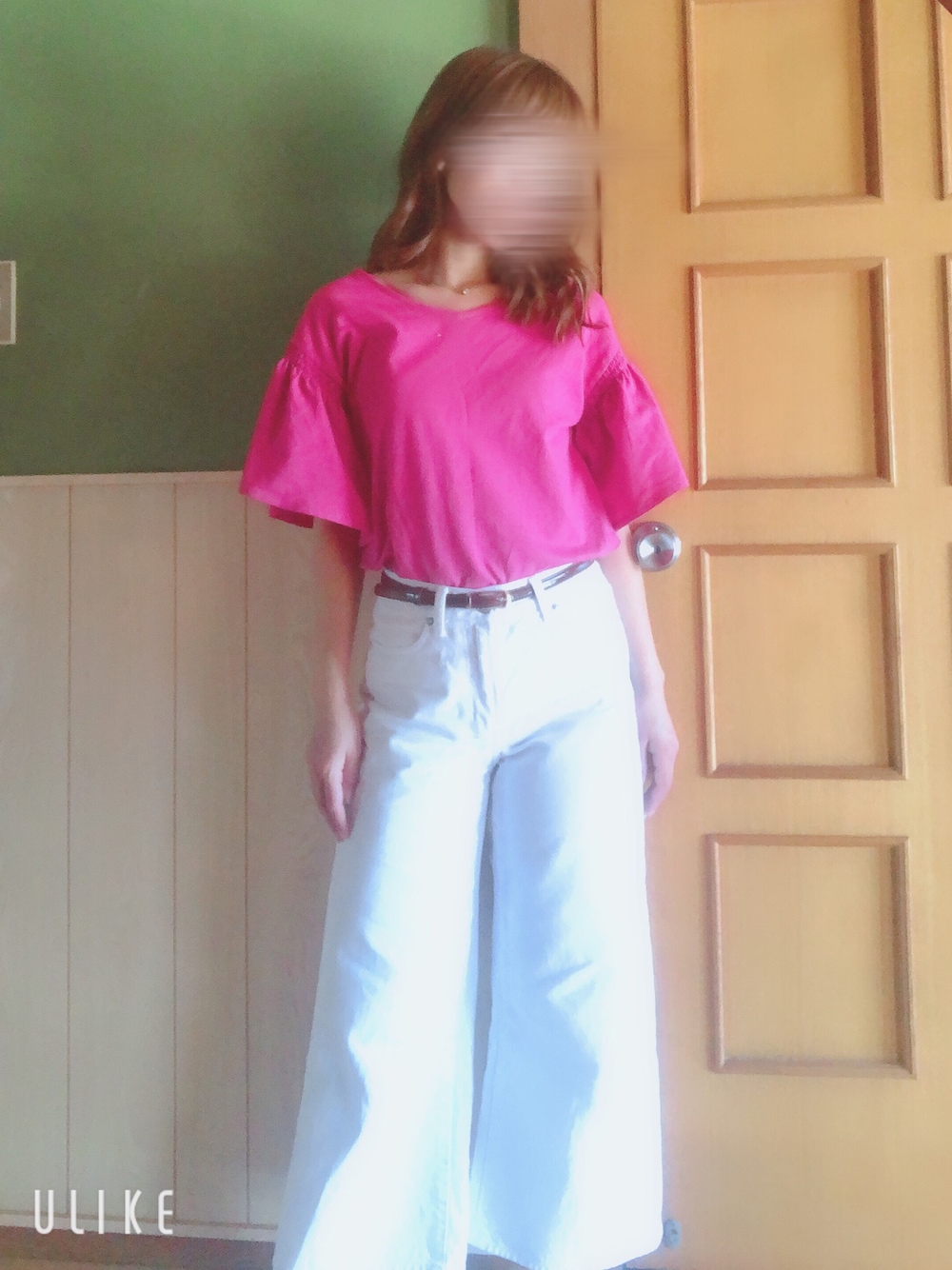 ピンクシャツに白のワイドパンツで シンプルに👚