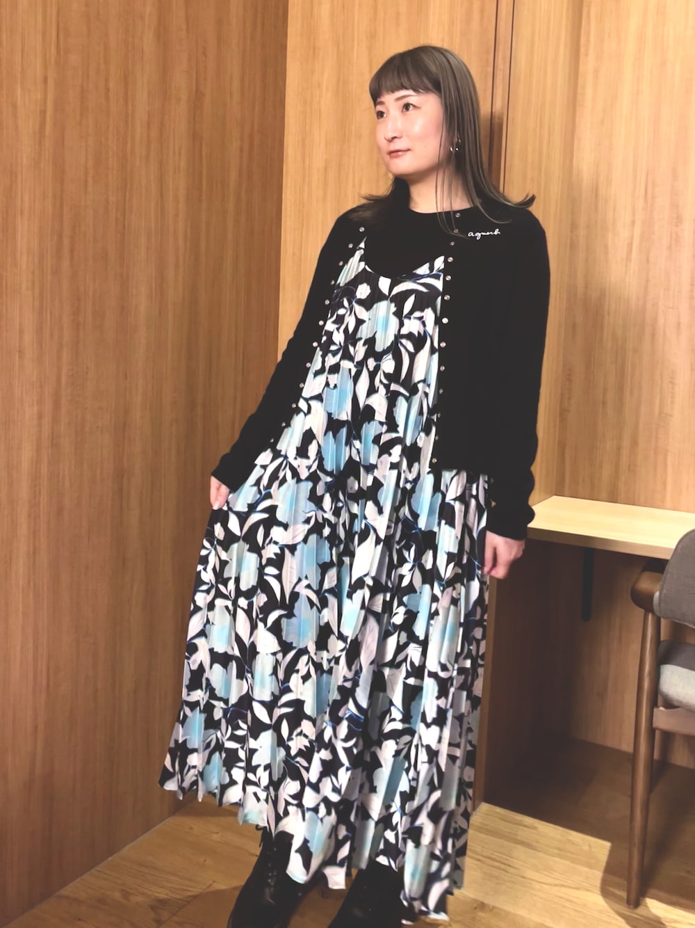 めちゃ頑張って買ったChristian Wijnantsのワンピース アニエスのカシミヤカーディガンと合わせて暖か黒コーデ カーディガンにagne's bのヘアピンでロゴをプラスしてます。