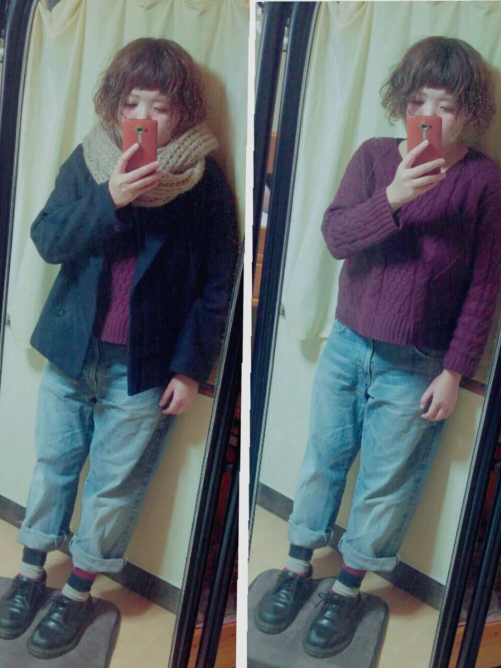 こんばんは😃🌃 見ていただきましてありがとうございます🙏🙏 今日はコート着まわし、デニムはEDWIN 古着です☺ ニットはボルドー☺ 靴下はダイソーで見つけました☺ 100均靴下すばらしい✨笑 寒いのでマフラーないとキツいです😵😵。。 いつもいいねありがとうございます🙏🙏
