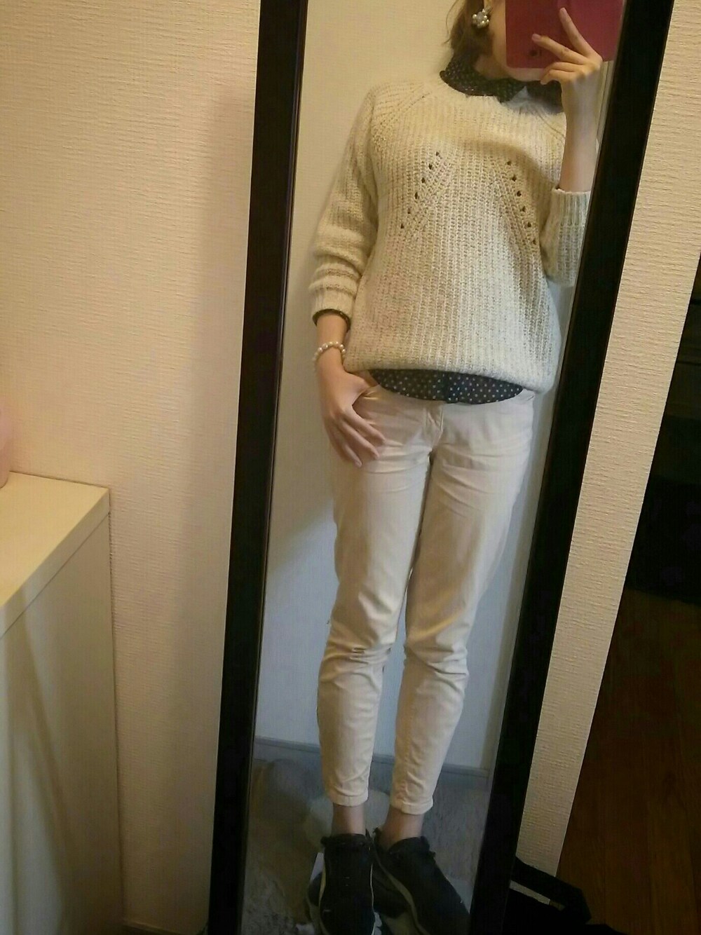 シャツ:UNIQLO ニット:ローリーズファーム パンツ:ZARA 靴:PUMA 寒さぶり返し、厚めのニットを 着用。春なのにー寒いー!