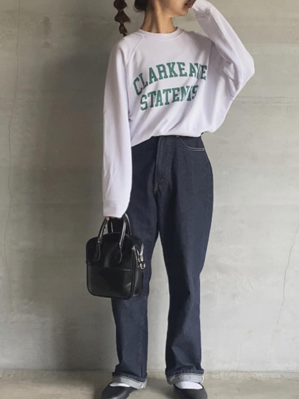 スウェット×デニム👖 ハイウエストのデニム合わせだったから インしてスッキリ💚