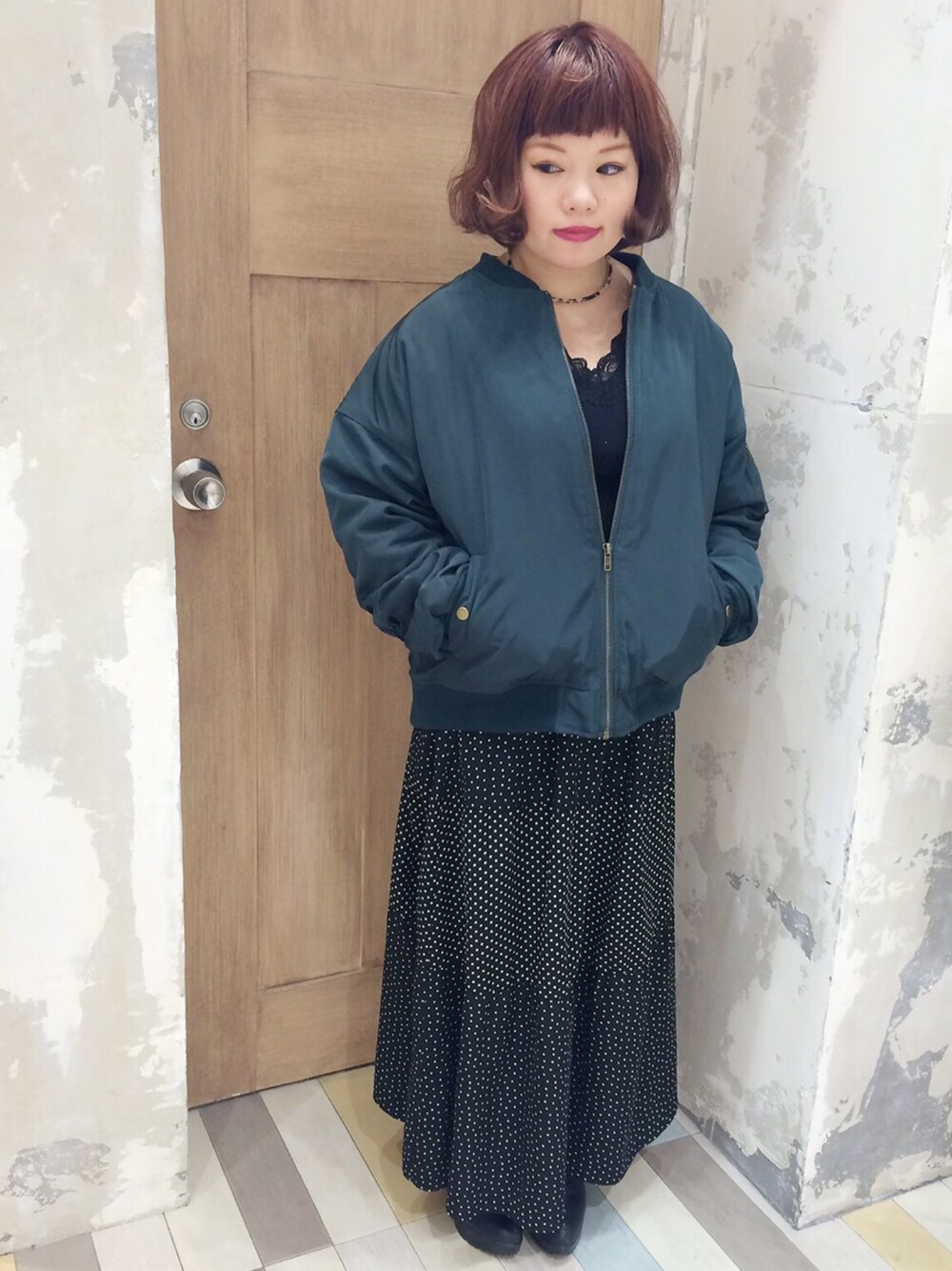 中綿入りのダボっと着れるMA1♡ 色もカーキじゃなくて深緑がおしゃれなんです! 今日は寒いからもう着れるのが嬉しいですね! 水玉大好きっ子必見のこのスカートはよく見ると水玉と四角柄なんですよ!